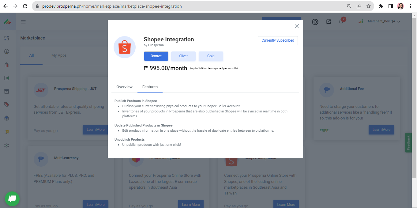 The ability for merchants to integrate their store catalog and publish products inside their Shopee store then sync orders from Lazada with Prosperna so that product inventory levels are always up to date.